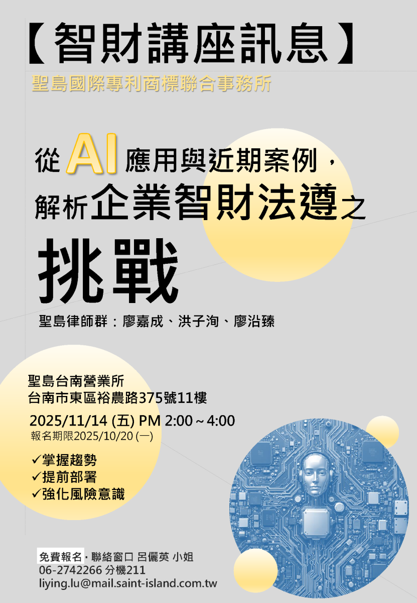 講題:「從AI應用與近期案例,解析企業智財法遵之挑戰」
